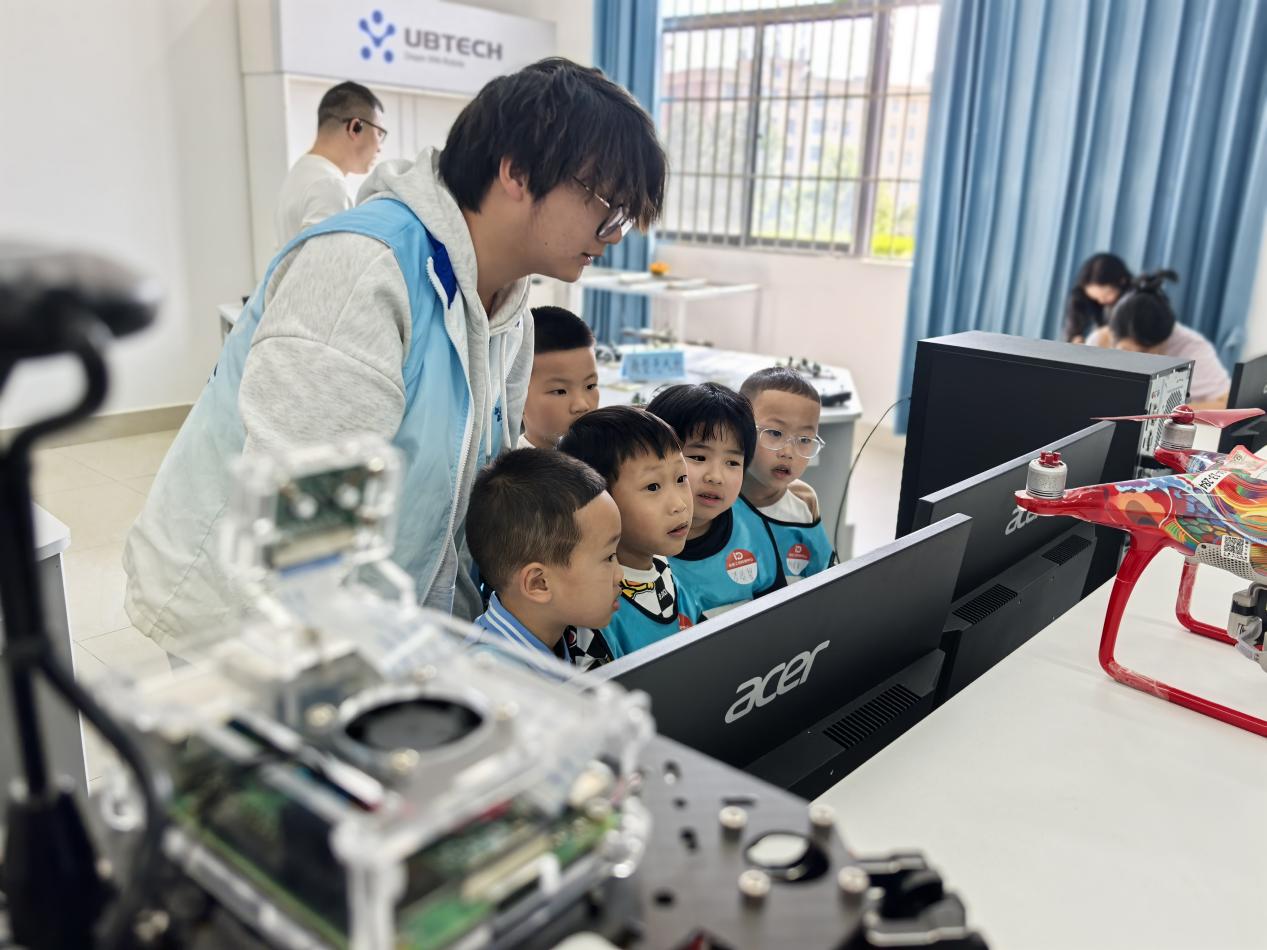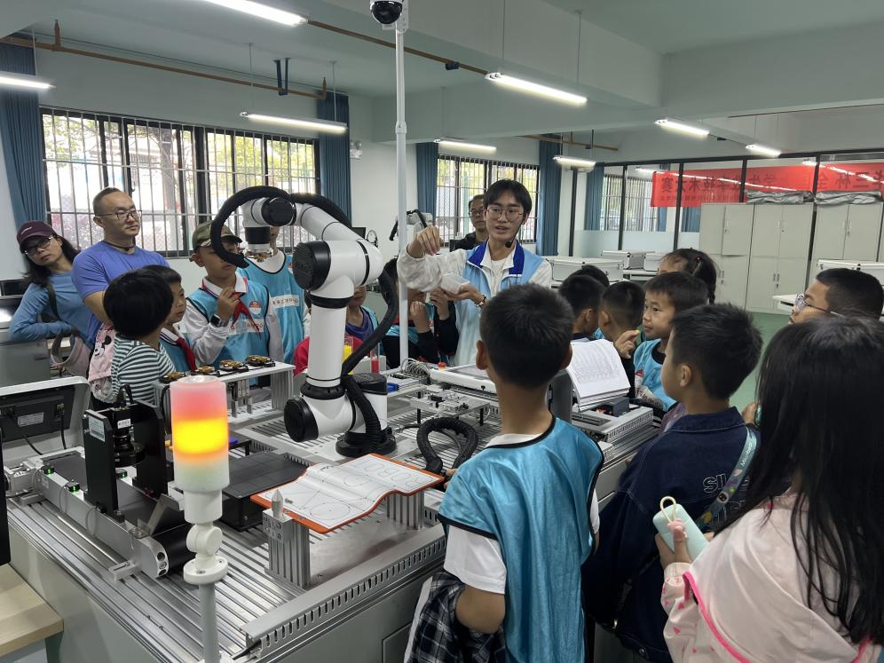 在大学生志愿者的有序引导下,来访师生及家长先后参观了无人驾驶航空系统工程专业实训中心、轨道交通信号与控制实验室、工业机器人实验室及无人机智能控制与仿真实验室。志愿者们结合现场实物设备,用通俗易懂的语言讲解机器人技术、无人机系统、轨道交通控制等前沿科技知识,指导少年儿童开展简单设备操作和虚拟现实体验,让抽象的科学原理变得直观可感。