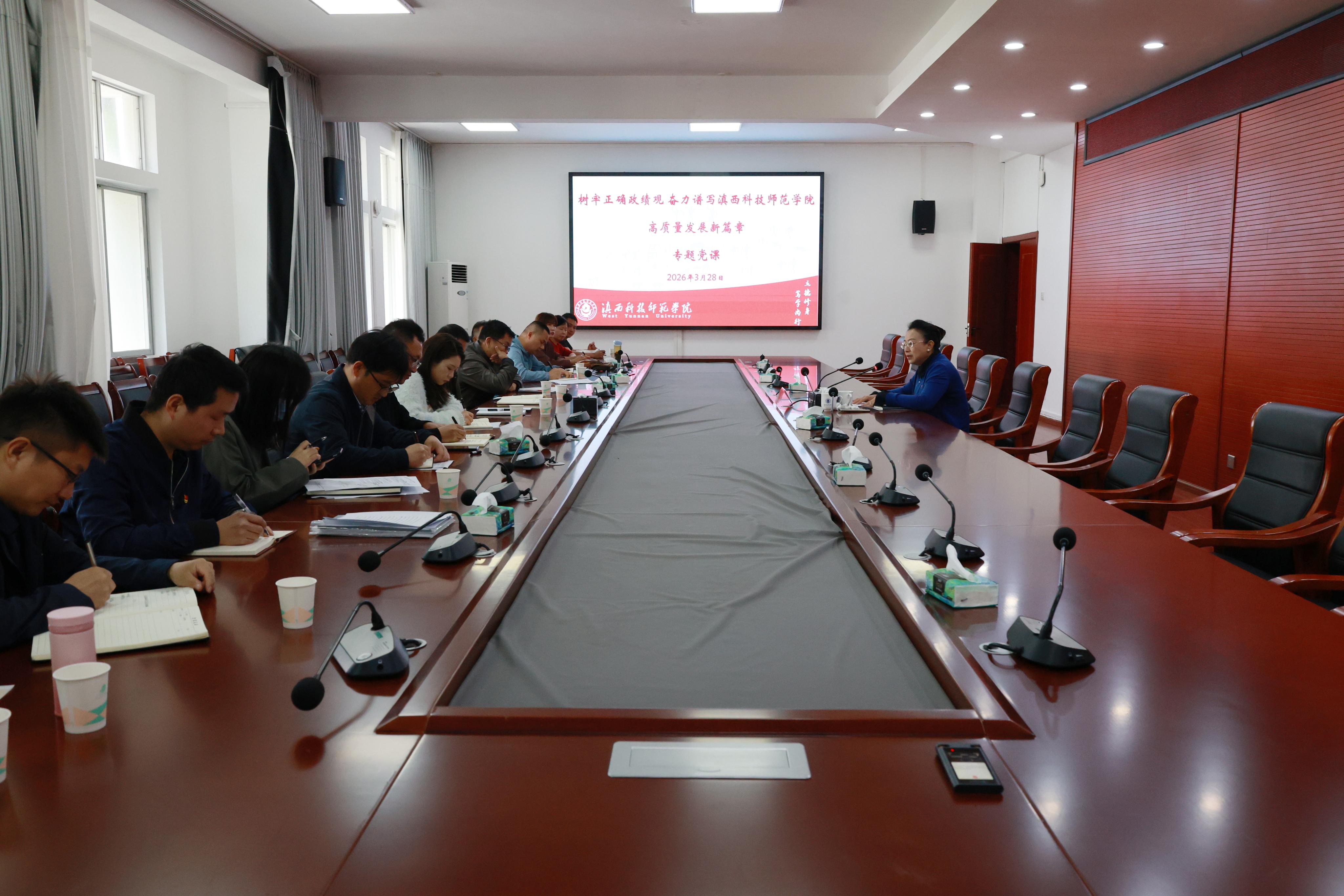 3月28日,学校党委副书记、校长刘艳红为发展规划中心、资产后勤管理中心、亚洲微电影学院等职能部门和二级学院负责人及骨干教师讲授专题党课。本次党课以锤炼党性修养、树立和践行正确政绩观为主线,通过系统阐述革命先辈事迹、教育系统先进典型与学校发展实际,为全体与会人员呈现了一堂思想深刻、内涵丰富的思政课,为学校“十五五”发展开局起步凝聚思想共识、指明行动方向。