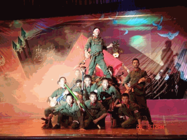 舞蹈《滚雷英雄》拉回了一段英雄的光荣历史:在1984年的对越战争中,五连九班班长安忠文勇敢地打头阵,在开辟道路中右前脚掌被炸掉,腹部多处受伤,双目失眠。舞台上枪炮声阵阵,演员们身着那个年代的军服,逼真地再现了当时的情景。
