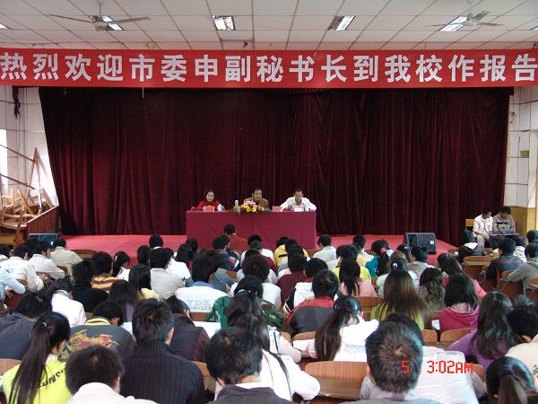 党委宣传部部长周孔张主持讲座,他说,自从胡锦涛同志提出‘学校教育人为本,德智体美,德育为先’的要求后,市委高度重视,认真贯彻执行。今天,特委派申副秘书长莅临我校开展讲座。到场的学生干部们对申副秘书长的到来报以热烈的掌声。