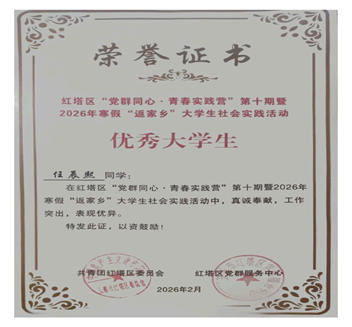 实践感悟:综合服务能力显著提升,荣获“优秀大学生”称号后更坚定了服务家乡、奉献社会的初心。今后将持续参与志愿服务,用专业所长为家乡发展贡献青春力量。